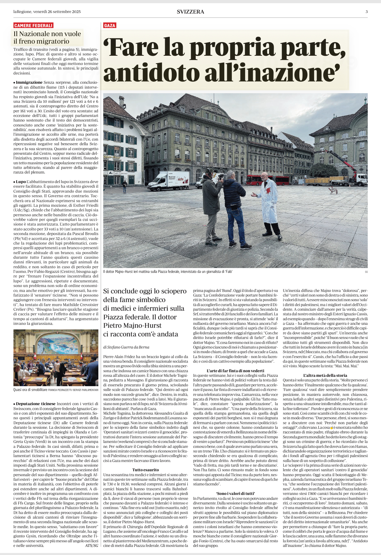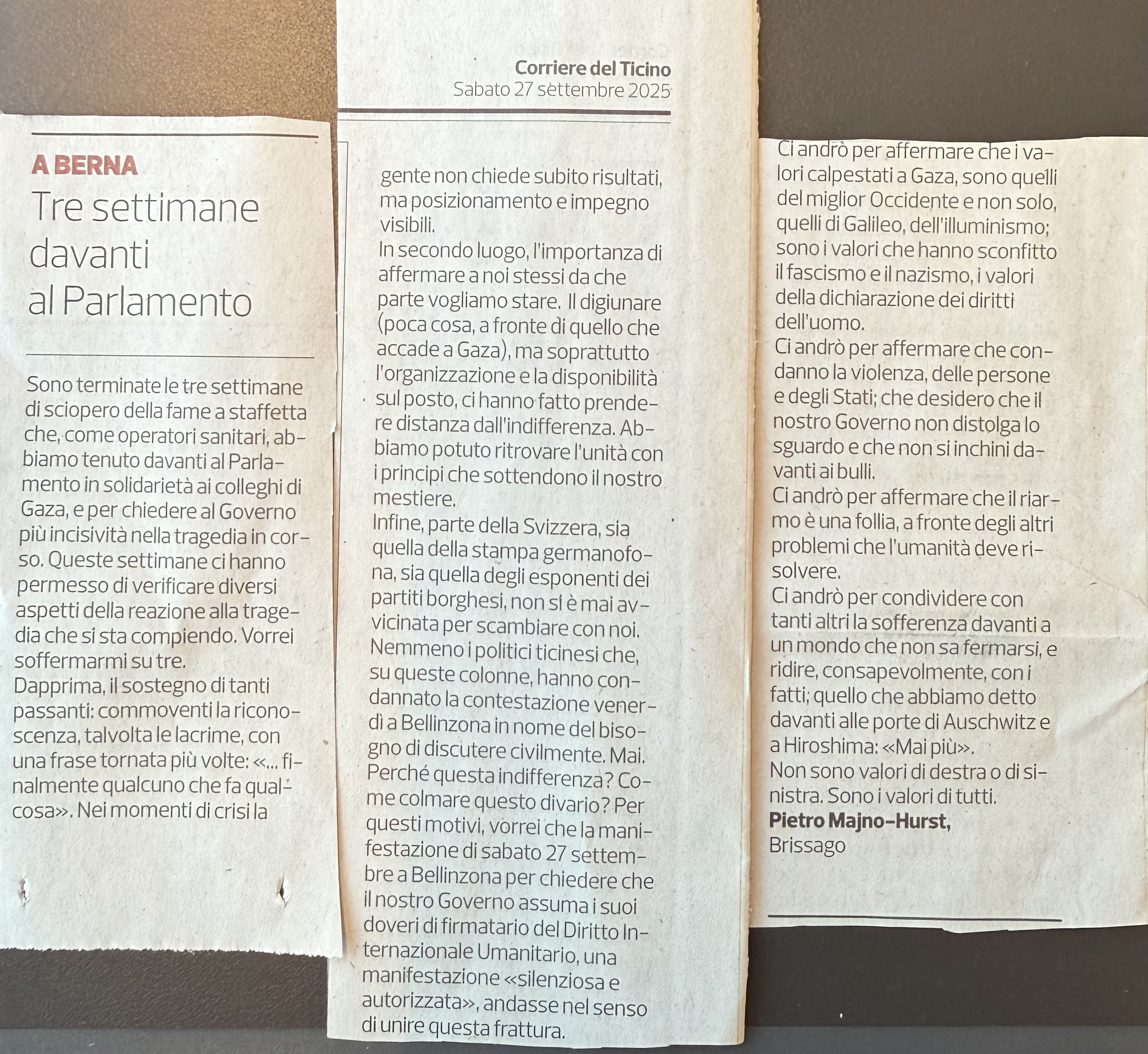 - Una lettera sul Corriere del Ticinovenerdì 27 settembre dopo le tre settimane di sciopero della fame a staffetta davanti al Parlamento.